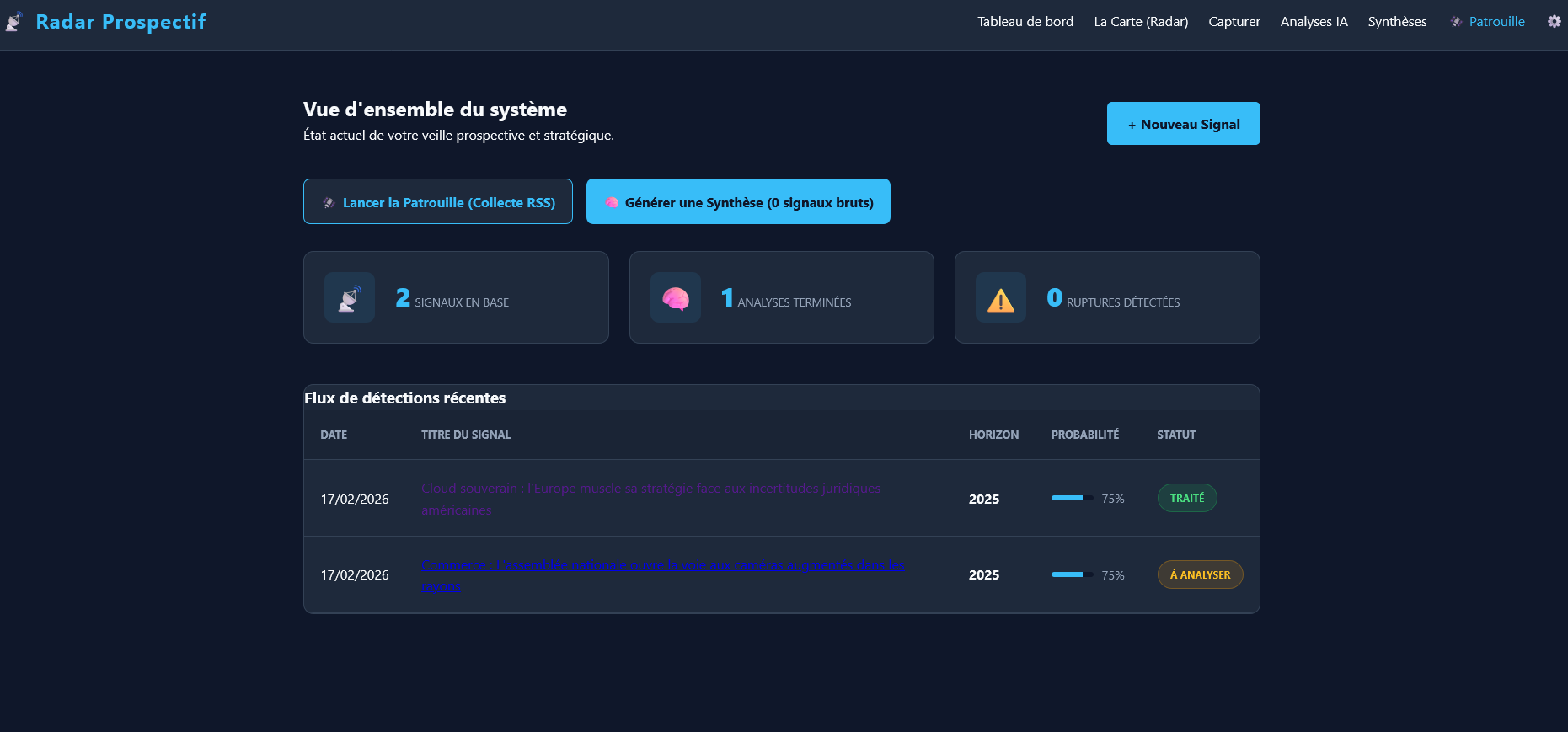 Analyse Individuelle : Pour chaque signal fort, l'IA génère un dossier d'impact PESTEL (Politique, Économique, Sociétal, Technologique, Environnemental, Légal).